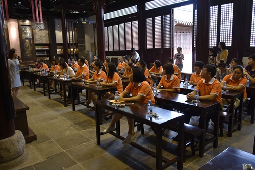 下午,考察团一行来到位于苏州人民路文庙府学崇圣祠内的德善书院,大家在少儿部华露副部长的介绍下参观了书院全貌。德善书院成立于2013年4月,是由苏州市文明办、教育局、文广新局等单位筹建的公益性教育机构,一直以来秉承“传播国学经典,弘扬德善风尚”的宗旨,常年公益举办传统文化讲座、中华经典诵读活动、市级道德讲堂、中外传统文化交流活动。现场,考察团老师们还亲身体验了一回国粹文化。