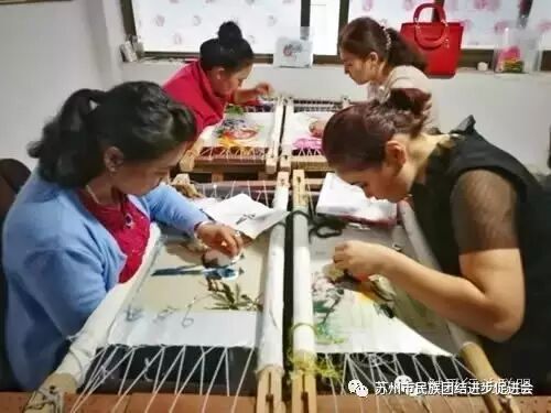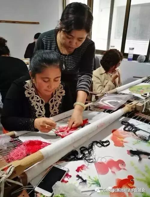 10月和12月,新疆塔城地区额敏县组织了两批共38名当地少数民族妇女来苏学习苏绣技艺,我会协助安排苏绣大师姚梅英为她们授课,教授苏绣基本技法,引领少数民族妇女脱贫致富,帮助该县劳动密集型纺织企业转型升级,得到了新疆学员的肯定和赞赏。