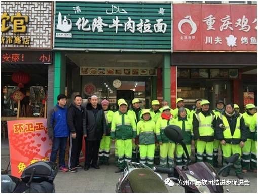 我会部分理事发动在苏拉面店业主开展“爱心拉面“活动,为环卫工人免费送拉面,节日期间走访慰问养老院。