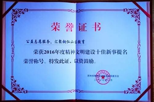 “红石榴伙伴”行动荣获苏州市2016年度精神文明建设十佳新事提名奖。